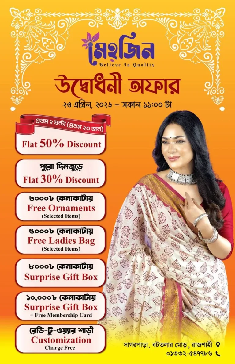 ২৩ এপ্রিল, ২০২৬ – বৃহস্পতিবার সকাল ১১টা ঠিক মেহ্জিনের নতুন শোরুমের দরজা খুলে যাবে রাজশাহীর ক্রেতাদের জন্য। পোস্টারের তথ্য অনুযায়ী, উদ্বোধনী অনুষ্ঠানটি অনুষ্ঠিত হবে সাগরপাড়া, বটতলা মোড়, রাজশাহী ঠিকানায়, যেখানে ইতোমধ্যেই ফ্যাশন ও লাইফস্টাইলপ্রেমীদের ভিড় থাকে বেশ জমজমাট। শহরের অন্যতম ব্যস্ত এই এলাকায় সহজেই পাবলিক ট্রান্সপোর্টে বা ব্যক্তিগত গাড়ি/বাইক নিয়ে আসা যায়, ফলে পরিবার নিয়ে শোরুমে আসতে কোনো ঝামেলাই হবে না।